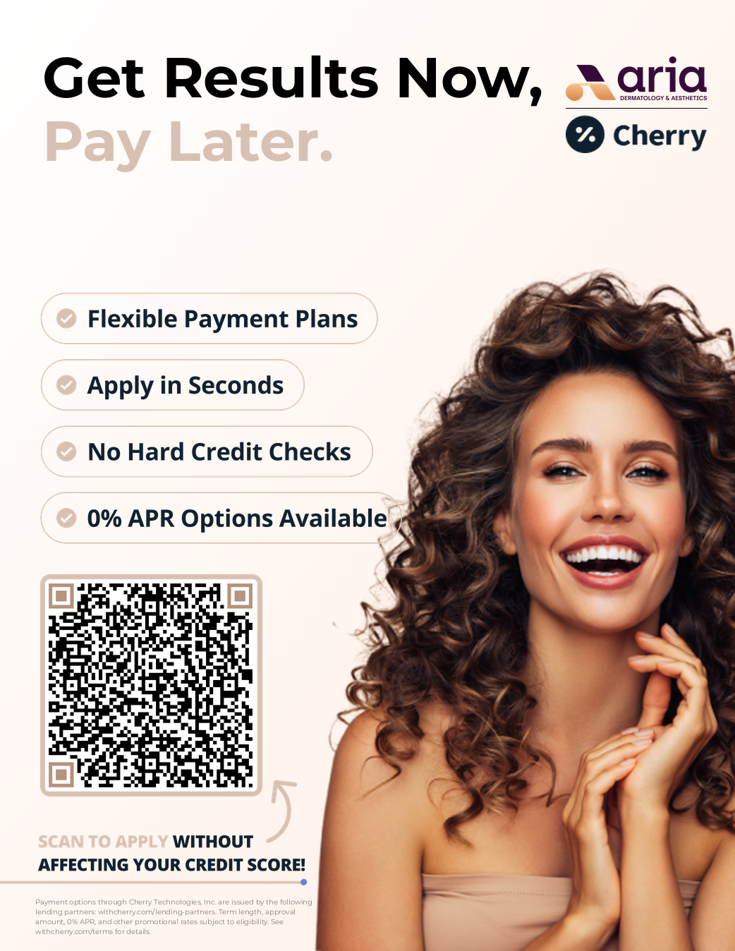 We understand that investing in your skin is just that—an investment. For patients who prefer flexibility, Aria offers payment options through Cherry, designed to support your treatment plan without compromising quality or timing.